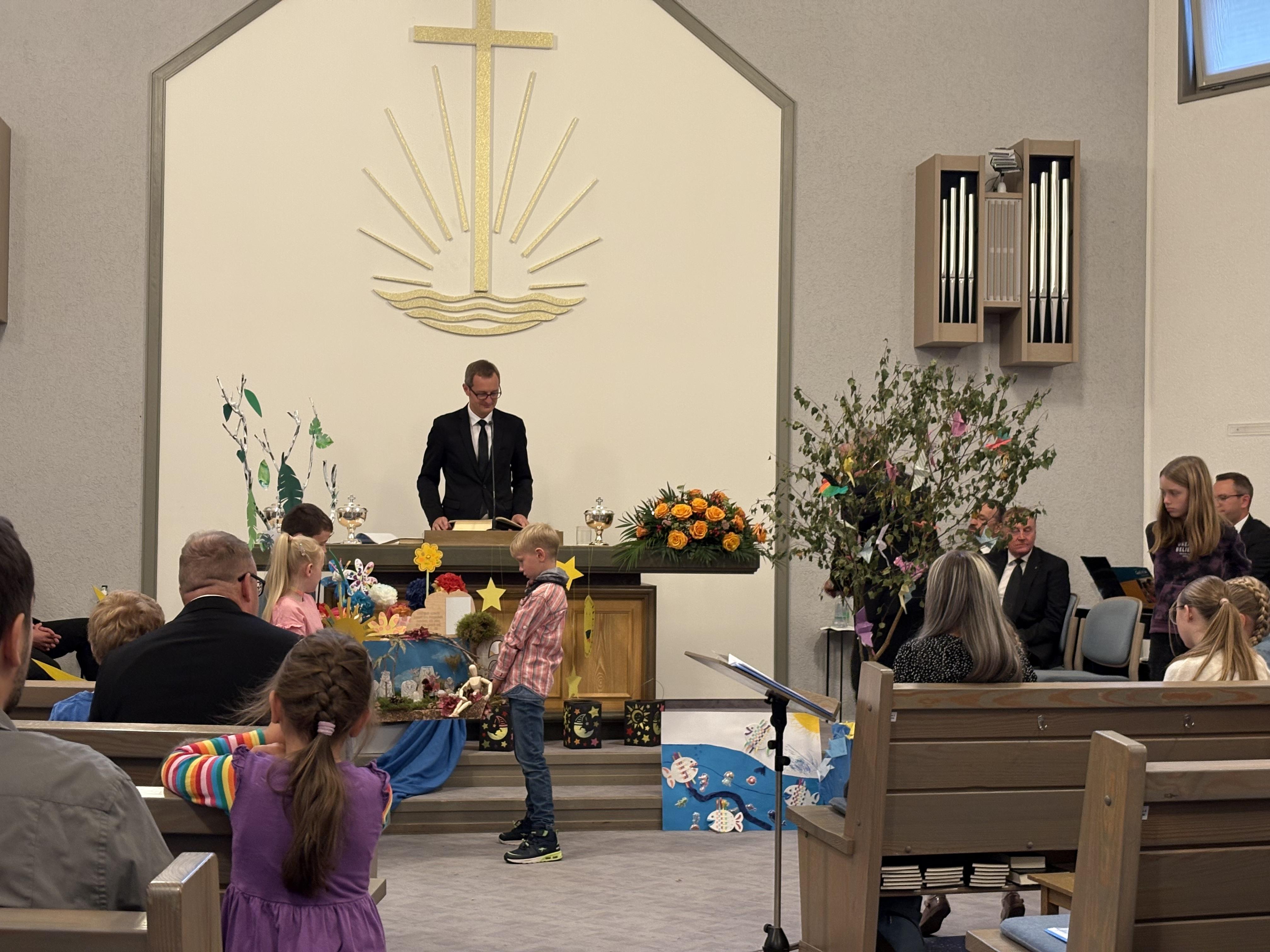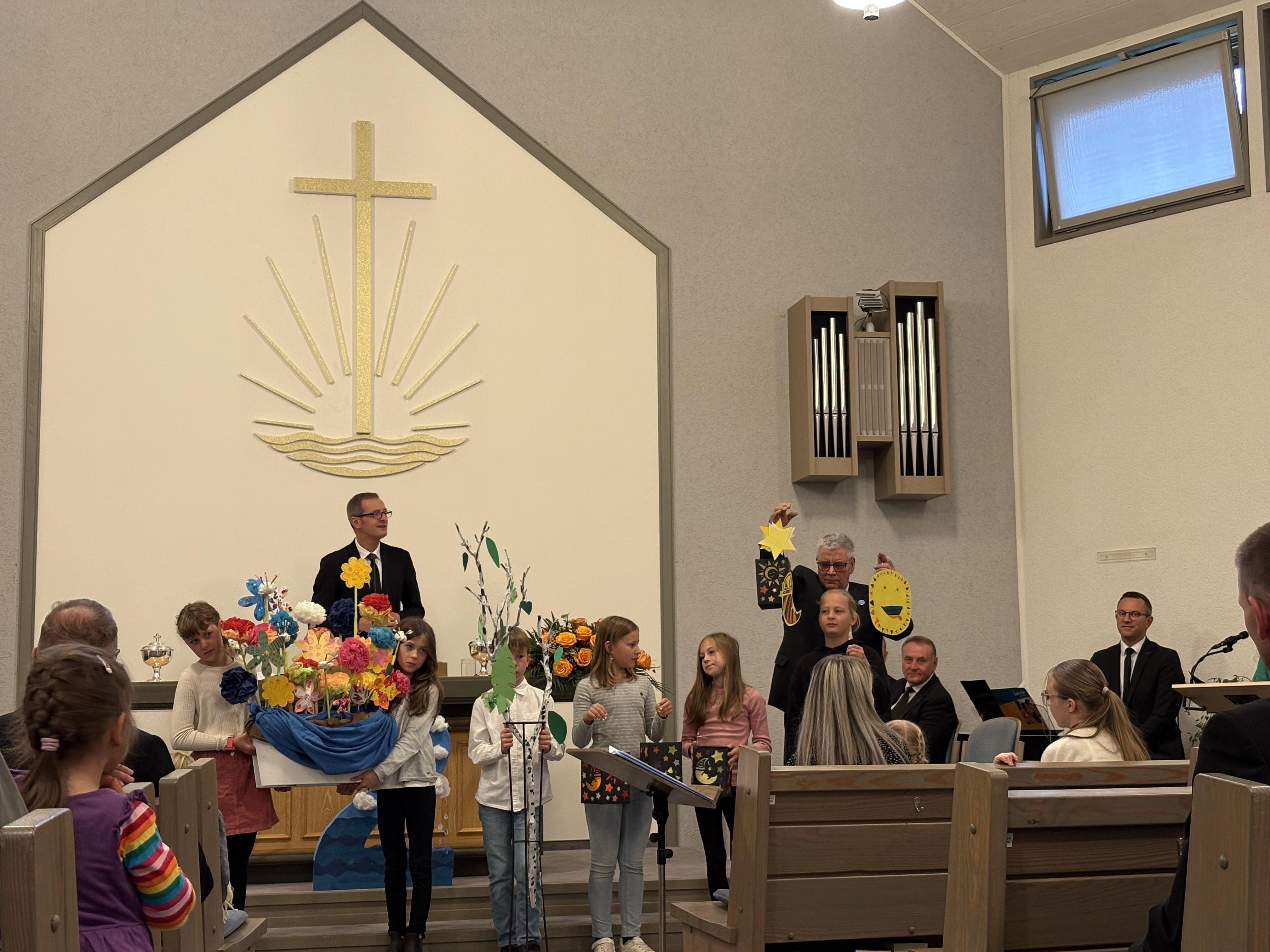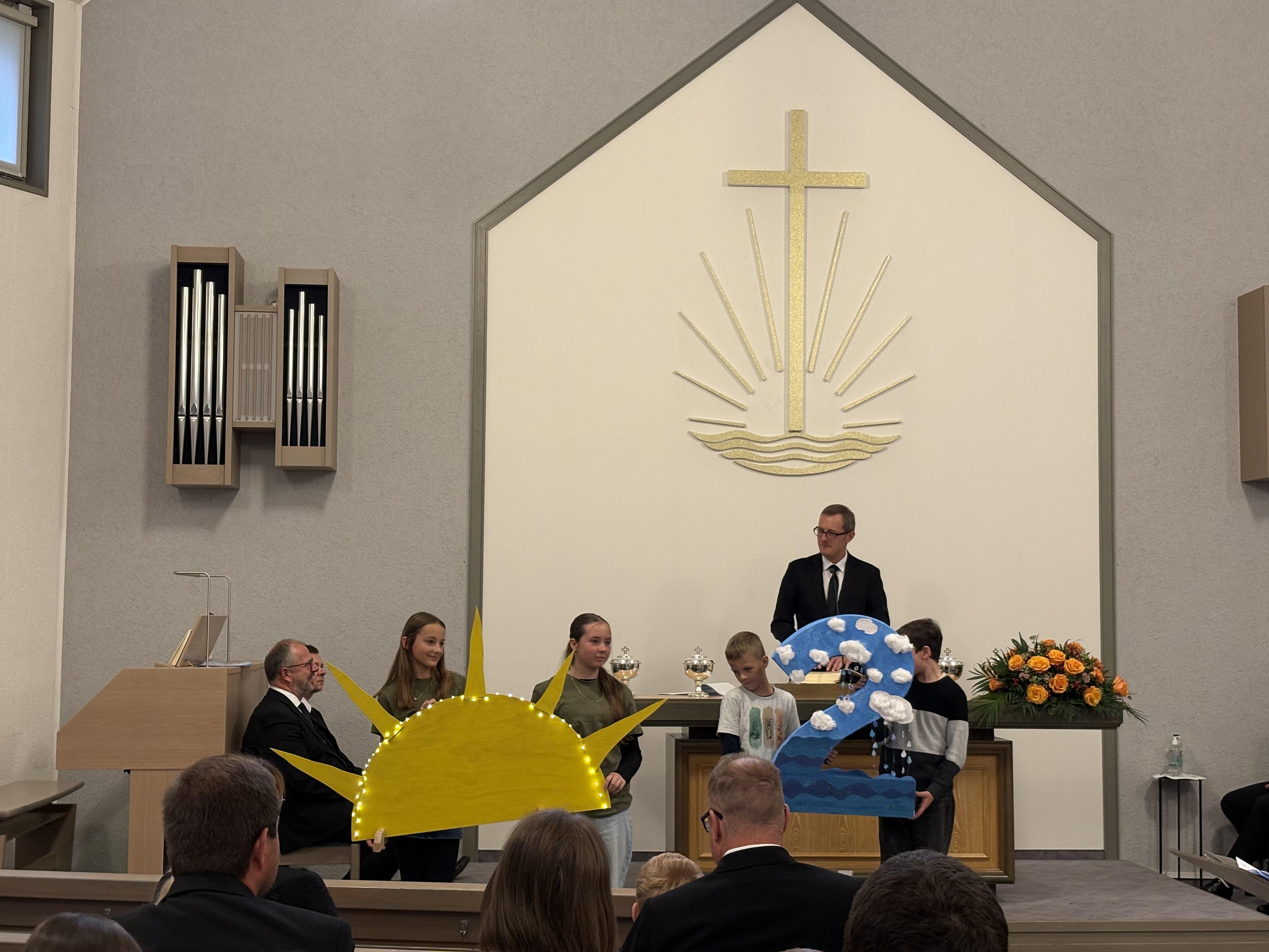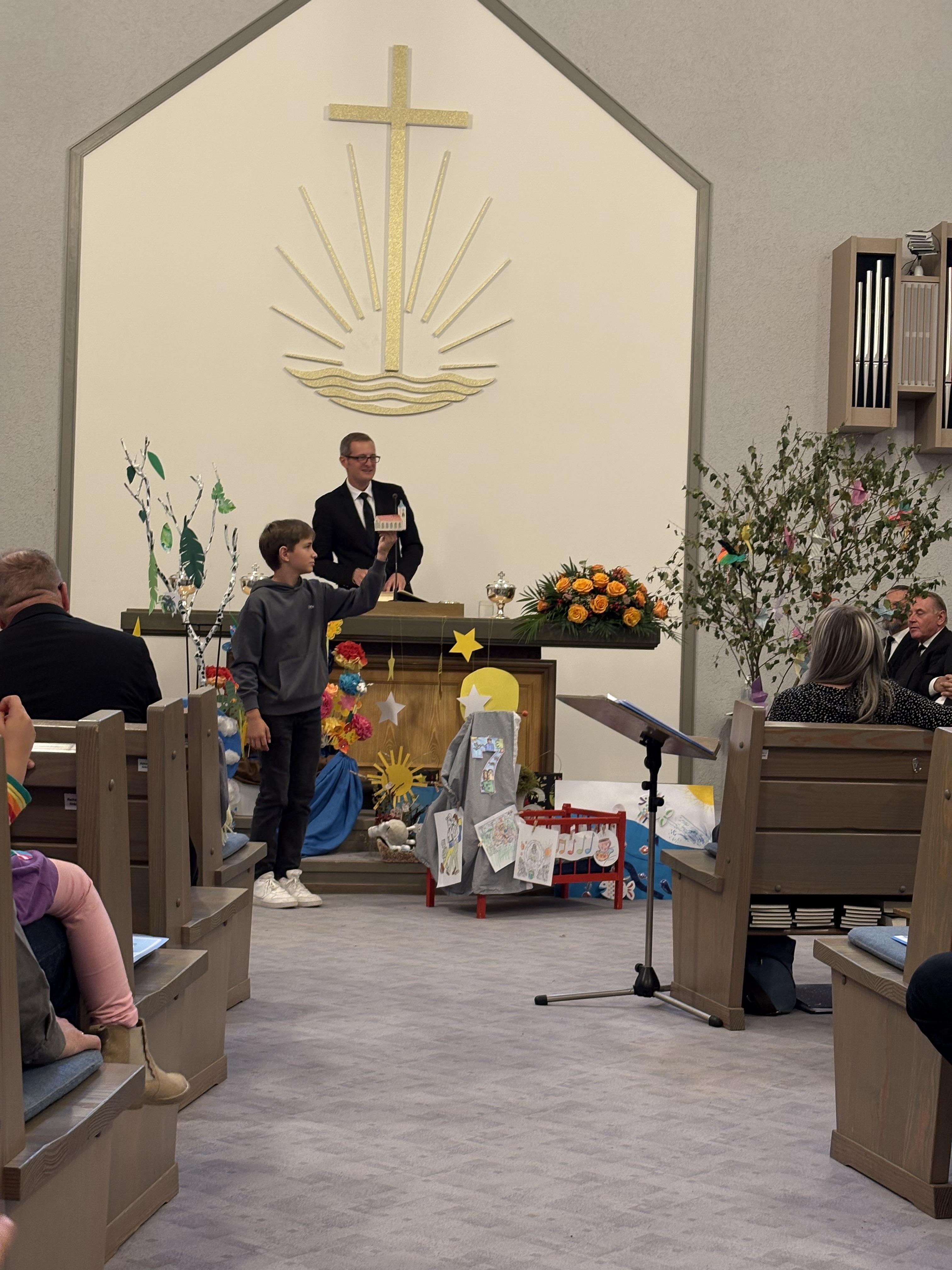 Dann begann der Gottesdienst. Es ging um die Schöpfung – die sieben Tage, an denen Gott alles gemacht hat. Zuerst war der Altar leer. Aber Stück für Stück wurde er voller: Licht, Himmel, Tiere, Pflanzen – alles, was Gott geschaffen hat. Wir haben gelernt: Gott macht alles sehr gut!