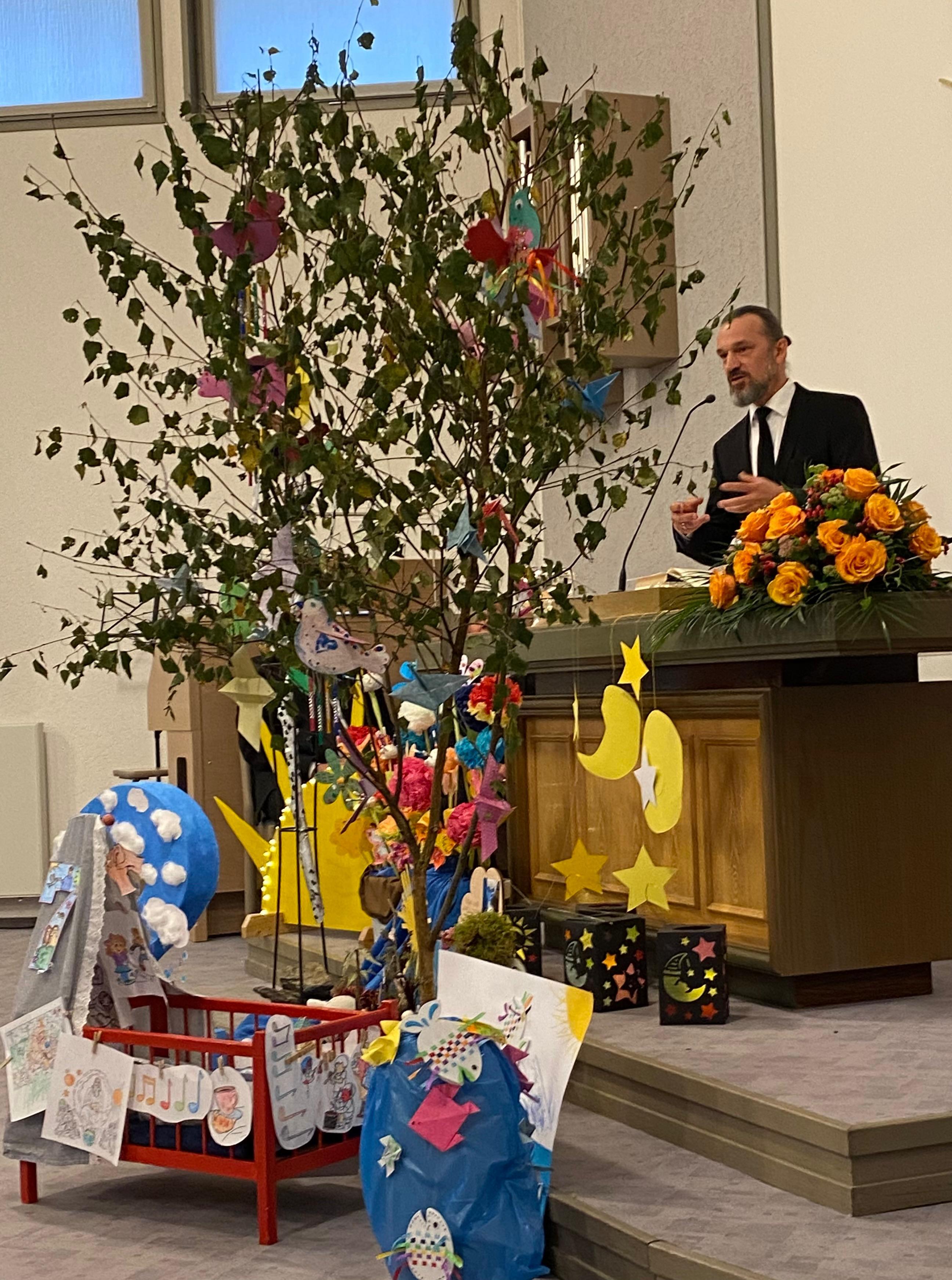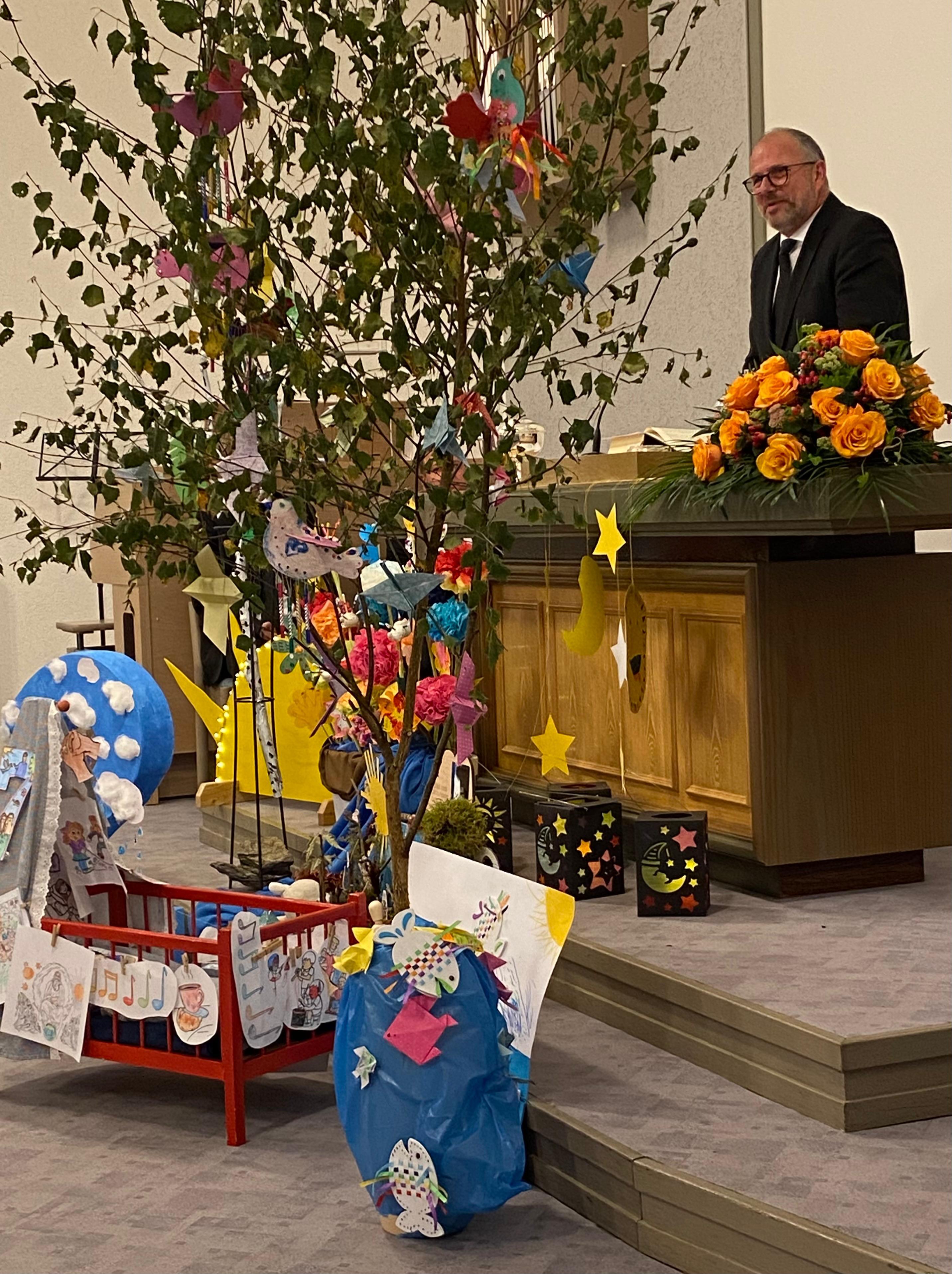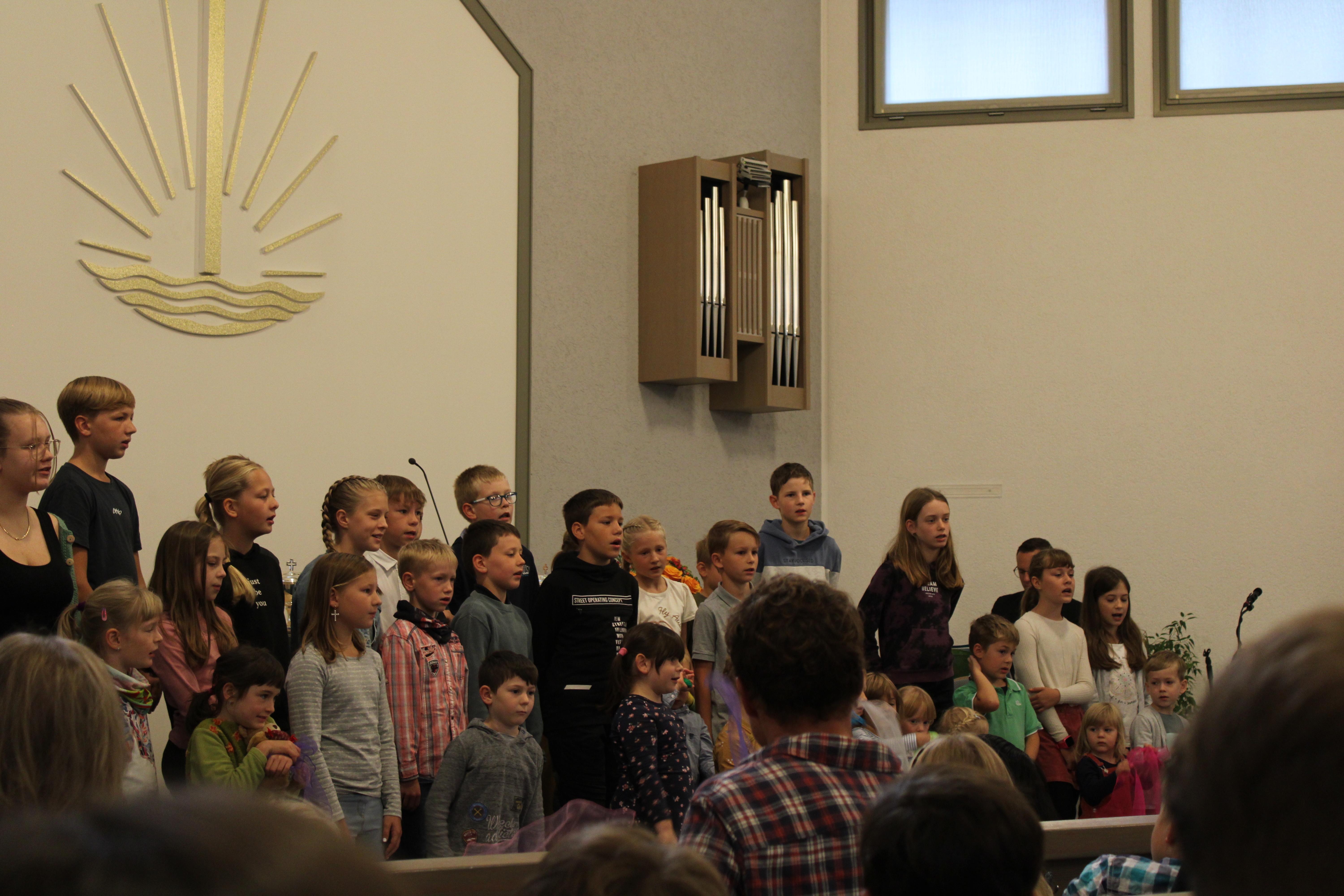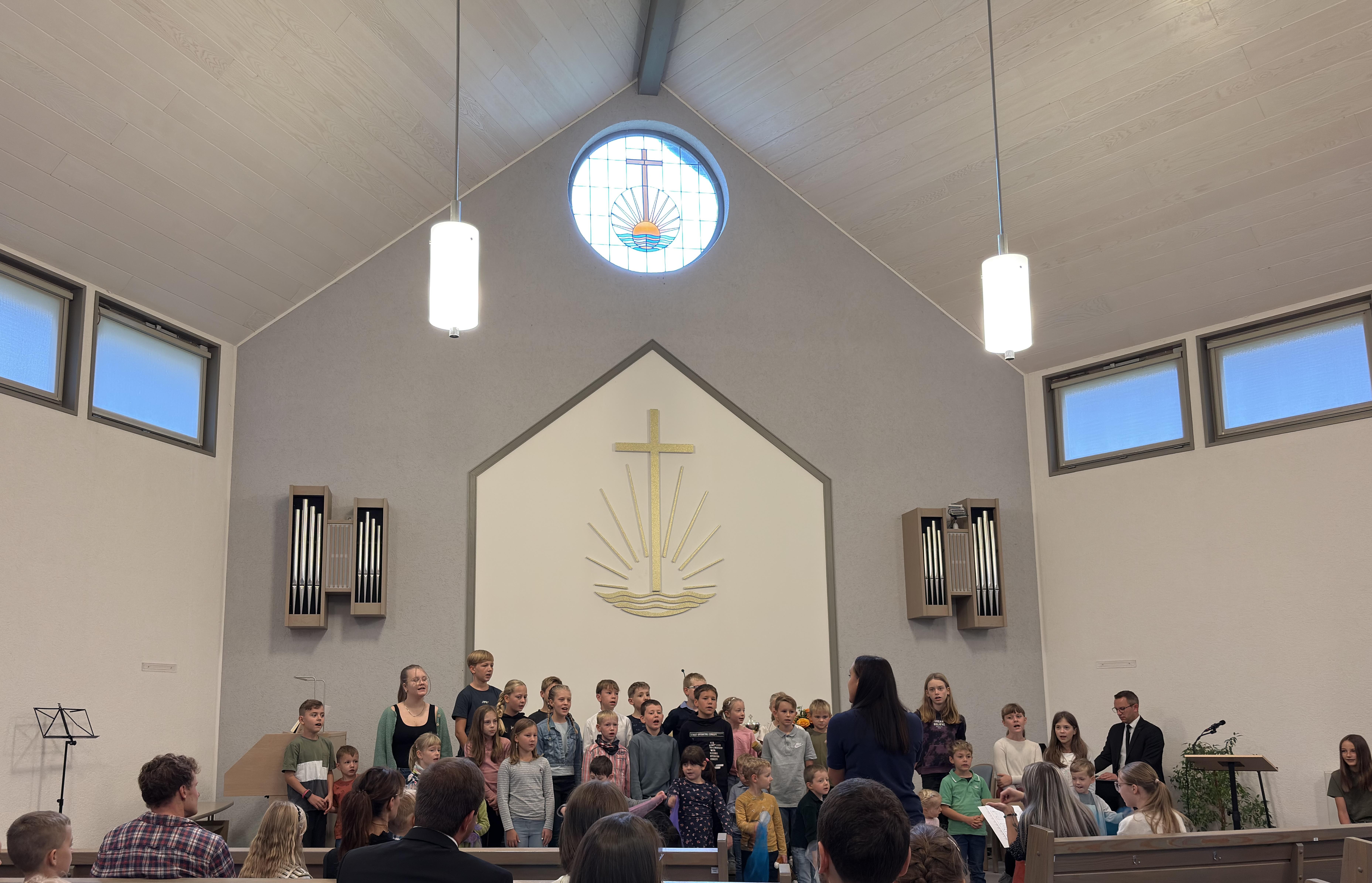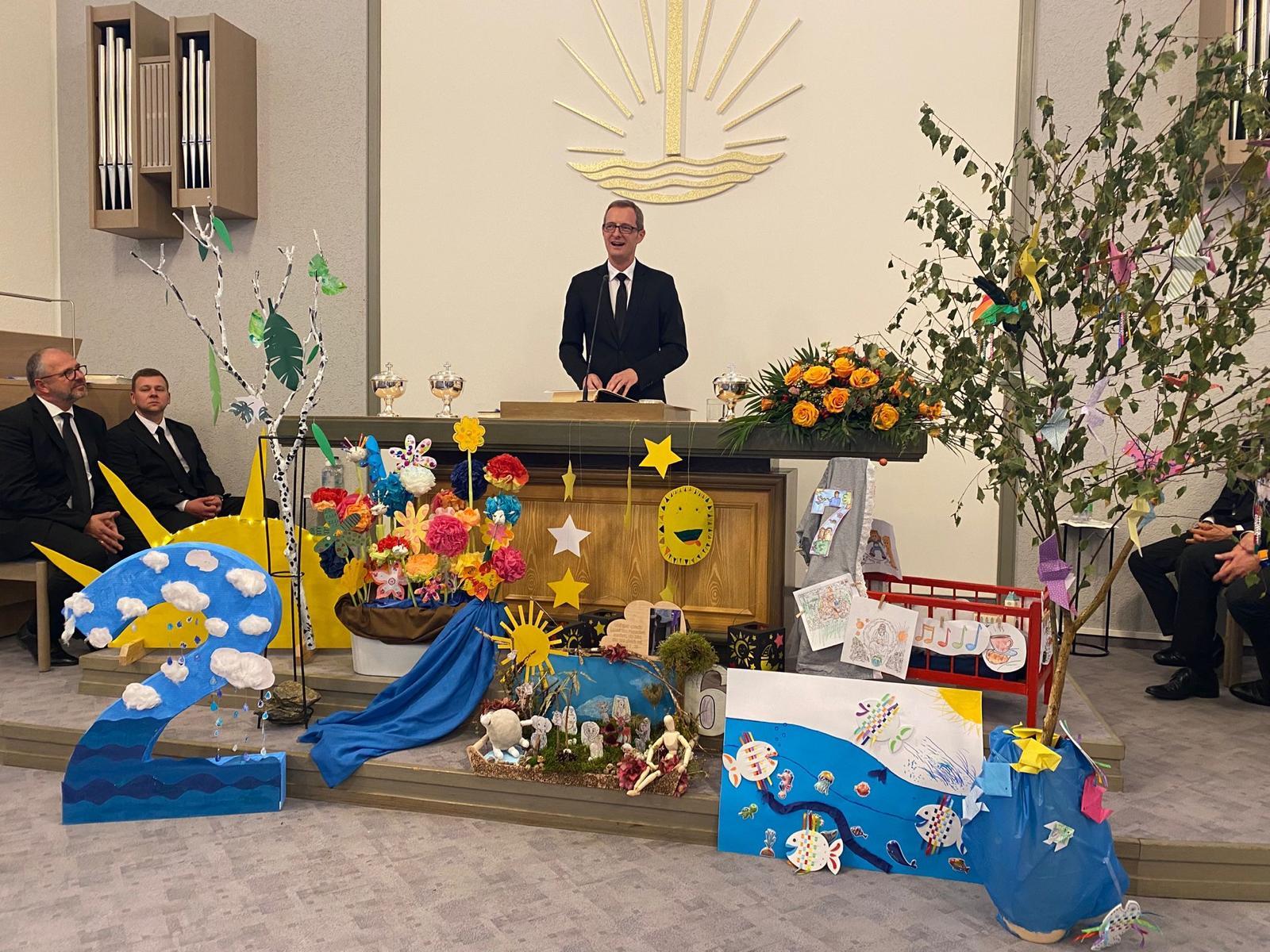Dann begann der Gottesdienst. Es ging um die Schöpfung – die sieben Tage, an denen Gott alles gemacht hat. Zuerst war der Altar leer. Aber Stück für Stück wurde er voller: Licht, Himmel, Tiere, Pflanzen – alles, was Gott geschaffen hat. Wir haben gelernt: Gott macht alles sehr gut!