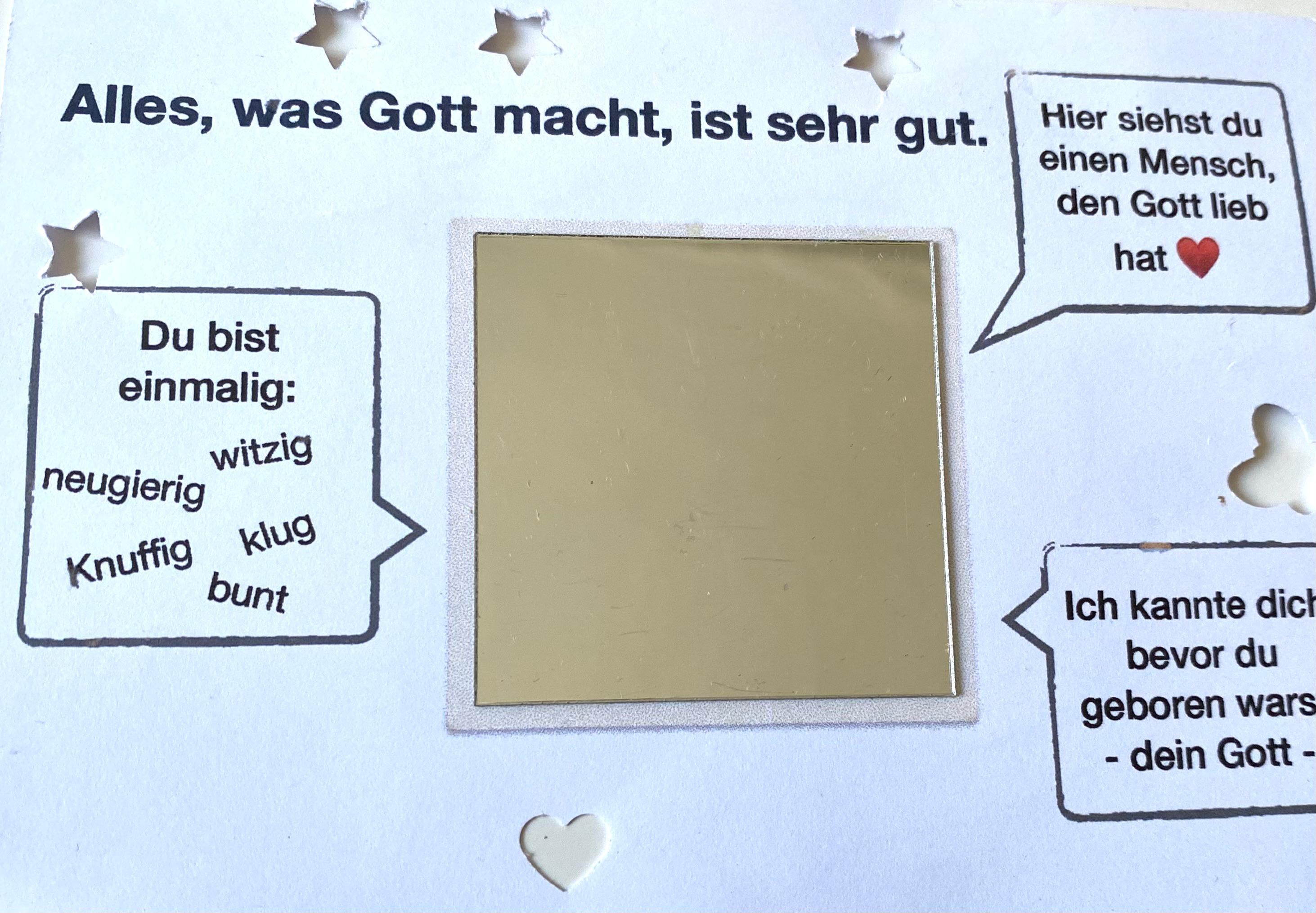 Da gab es ganz viele spannende Schöpfungs-Stationen: Edelsteine suchen, Wolken basteln, Seifenblasen, Tiere entdecken, einen Spiegelschrank, ein Kurzfilm und vieles mehr. Am Ende hatten wir eine volle Stempelkarte und bekamen tolle Geschenke: einen Schlüsselanhänger in Form einer Erdkugel, Pflanzensamen und einen Pflanzenstecker.